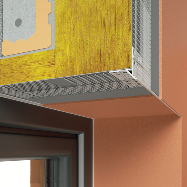 Odkapni profil z odkapnim robom in mrežico iz steklenih vlaken za zaključke, kjer je potreba po odkapu (balkon, podzidek itd.) v sistemu toplotne izolacije – ETICS.