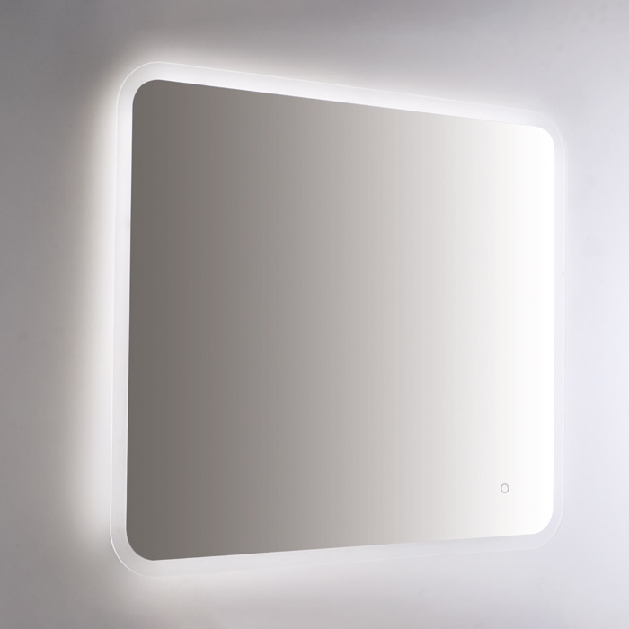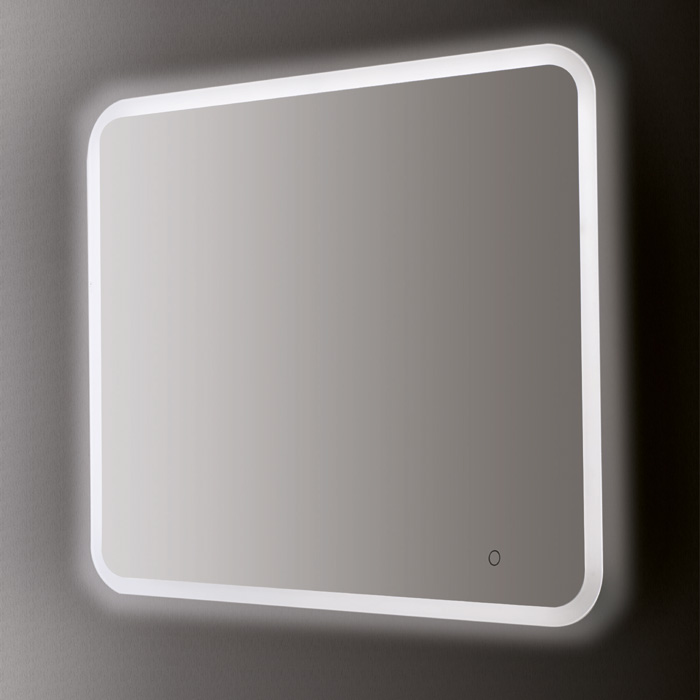 Stensko ogledalo, pravokotne oblike z zaobljenimi robovi, z LED ambientalno osvetlitvijo zadaj, upravljanje (vklop/izklop) na dotik s pomočjo stikala na senzor ter funkcijo zatemnitve. Ogledalo je reverzibilno in se ga lahko namesti pokončno ali ležeče. Obrobni pas ogledala je zaključen s peskanjem.